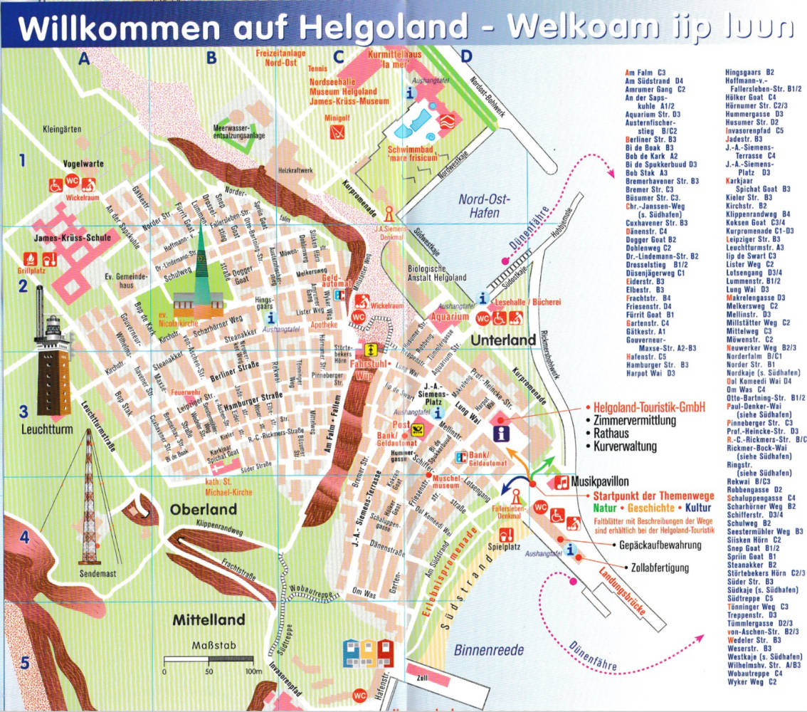 Die Insel Helgoland – Felsmassiv von bizarrer Naturschönheit mit seiner grünen Landschaft, dem Klippenrandweg und der Langen Anna, dem Wahrzeichen der Insel – wird mit vollständigem Inselplan und kurzem Infolexikon vorgestellt.